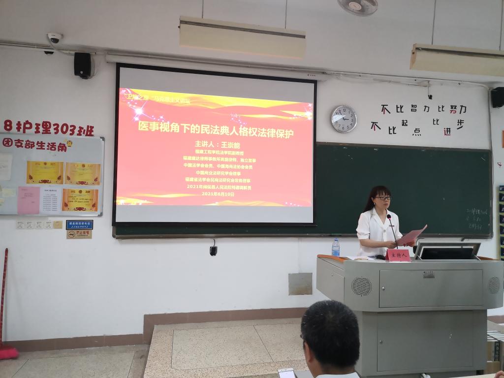 為深入貫徹落實習(xí)近平法治思想和中央全面依法治國工作會議精神,落實教育部黨組推進習(xí)近平法治思想進教材、進課堂、進頭腦工作部署,切實將習(xí)近平法治思想納入高校法治理論教學(xué)體系,提高思想政治理論課教師和我校學(xué)生法治素養(yǎng),特別邀請福建工程學(xué)院法學(xué)院副教授、福建建達律師事務(wù)所高級律師王崇能于2021年6月10日來我校開展《醫(yī)事視角下的民法典人格權(quán)法律保護》的專題講座。講座由我校馬克思主義學(xué)院院長熊美蘭主持,百余名師生參與講座。