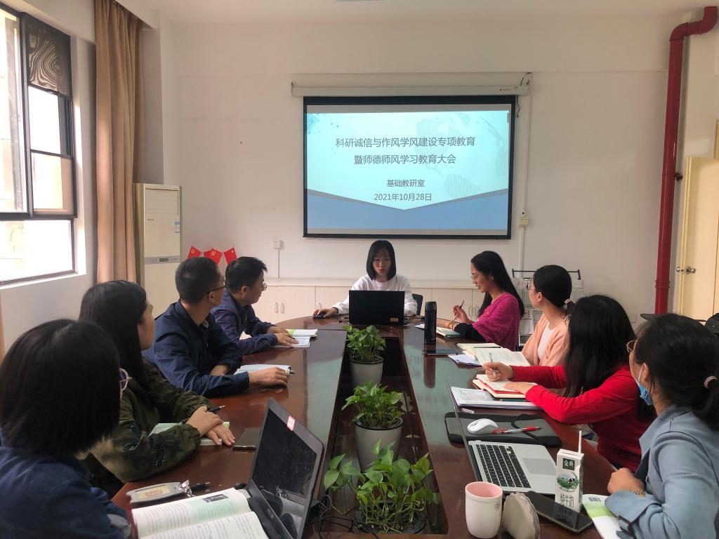 為進(jìn)一步加強(qiáng)師德師風(fēng)建設(shè),貫徹落實(shí)我校開展科研誠信與作風(fēng)學(xué)風(fēng)建設(shè)工作安排,2021年10月28日上午,馬克思主義學(xué)院基礎(chǔ)教研室召開科研誠信與作風(fēng)學(xué)風(fēng)建設(shè)專項(xiàng)教育暨師德師風(fēng)學(xué)習(xí)教育大會(huì)。