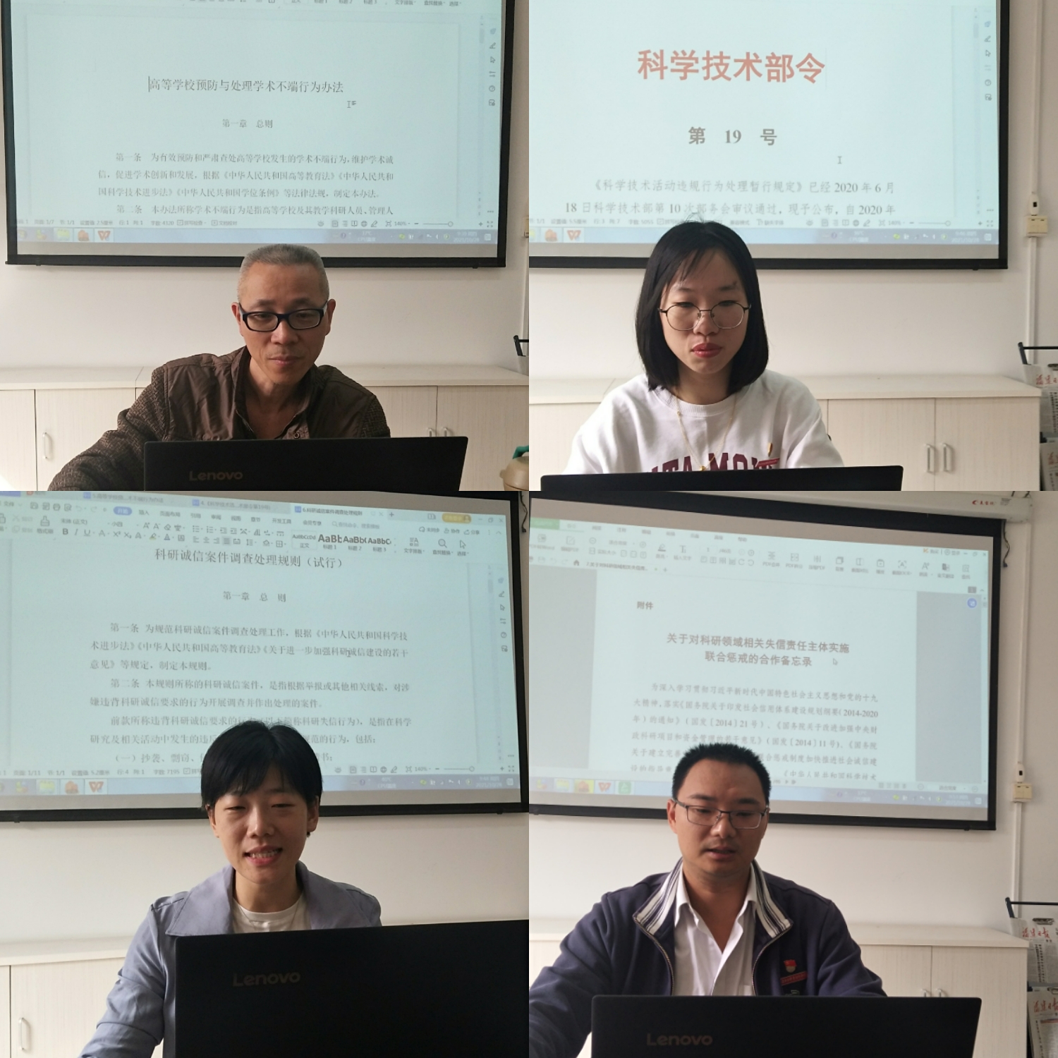 概論教研室主任胡濟林、基礎教研室主任顏冰鳳、形勢與政策教研室主任鄭冰和就業(yè)指導與軍事理論教研室張崇飛分別帶領(lǐng)全體教師開展各項文件的學習討論,內(nèi)容包含《高等學校預防與處理學術(shù)不端行為辦法》《科學技術(shù)活動違規(guī)行為處理暫行規(guī)定》《關(guān)于對科研領(lǐng)域相關(guān)失信責任主體實施聯(lián)合懲戒的合作備忘錄》《科研誠信案件調(diào)查處理規(guī)則》。