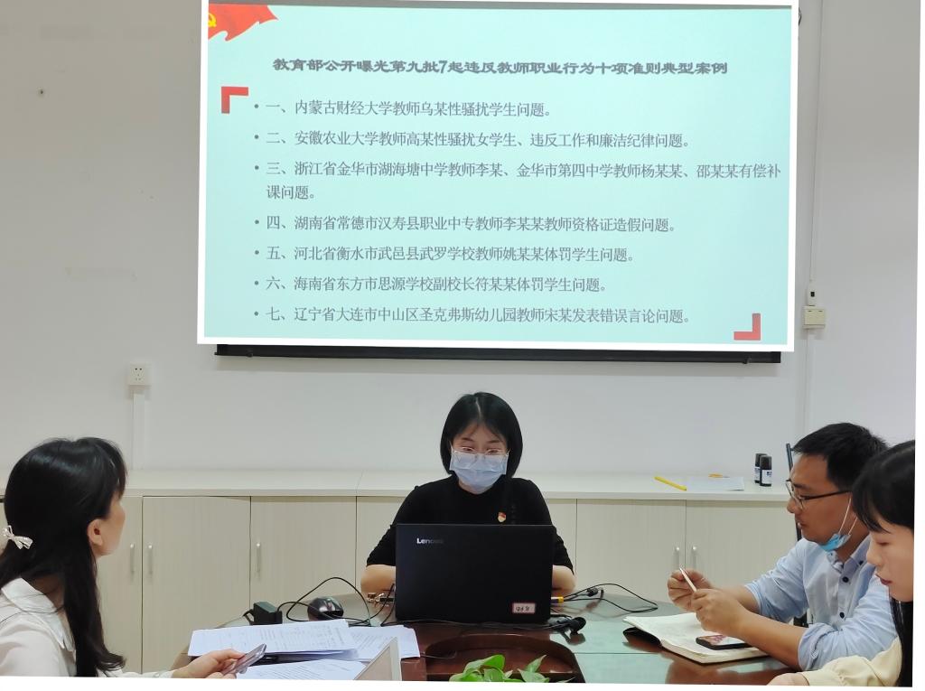 會(huì)上,羅蕓老師通報(bào)了教育部公開(kāi)曝光第九批7起違反教師職業(yè)行為十項(xiàng)準(zhǔn)則典型案例,強(qiáng)調(diào)學(xué)院教師要深刻認(rèn)識(shí)自己肩負(fù)的職責(zé)和使命,牢記為黨育人、為國(guó)育才初心,自重自省,堅(jiān)守師德底線。