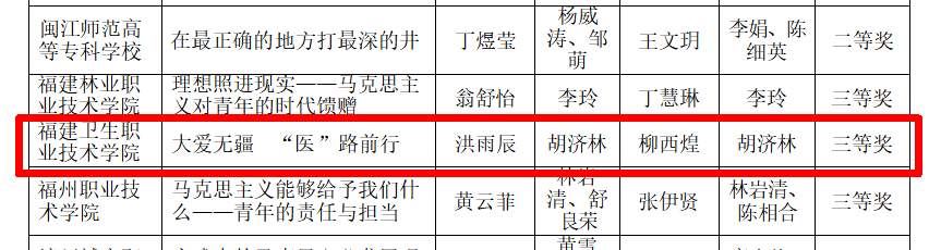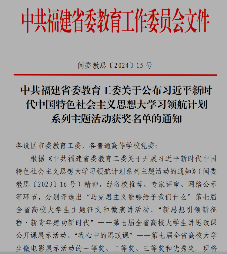 日前,由中共福建省委教育工作委員會(huì)主辦的習(xí)近平新時(shí)代中國(guó)特色社會(huì)主義思想大學(xué)習(xí)領(lǐng)航計(jì)劃系列主題活動(dòng)獲獎(jiǎng)名單揭曉,我校學(xué)生劉琦琛、許晶晶、李木子獲得“新思想引領(lǐng)新征程·新青年建功新時(shí)代”——第七屆全省高校大學(xué)生講思政課公開(kāi)課展示活動(dòng)一等獎(jiǎng),洪雨辰、柳西煌獲得“馬克思主義能夠給予我們什么”第七屆全省高校大學(xué)生主題征文和微演講活動(dòng)三等獎(jiǎng)1項(xiàng),指導(dǎo)老師為胡濟(jì)林、劉穎。