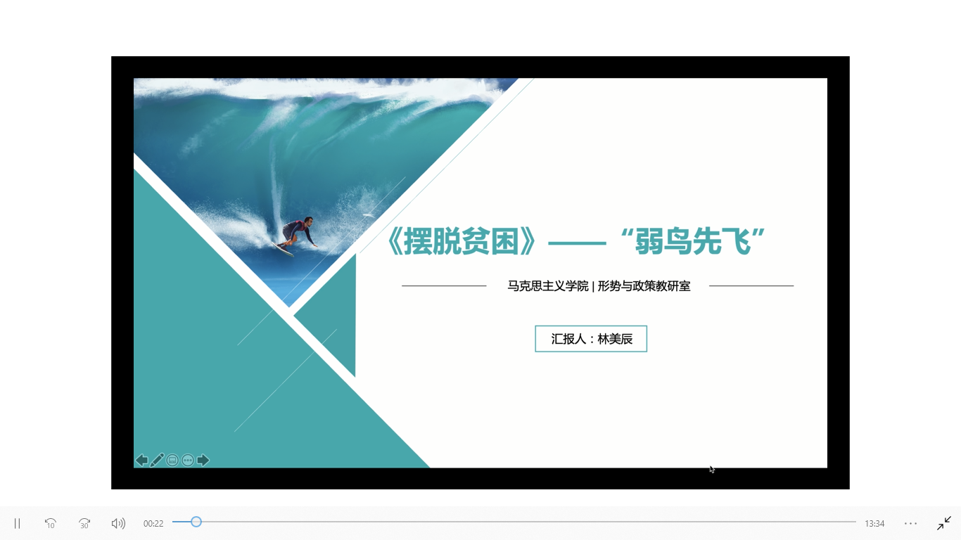 活動中,林美辰首先為我們介紹了《弱鳥如何先飛》這篇文章的背景介紹。這篇調(diào)查隨感,是習(xí)近平擔(dān)任寧德地委書記期間,協(xié)同地區(qū)幾位領(lǐng)導(dǎo)同志調(diào)研了閩東九縣,比較系統(tǒng)地闡述了如何認(rèn)識貧困地區(qū)發(fā)展、貧困地區(qū)如何發(fā)展兩大問題。接著,她從該文章架構(gòu)與導(dǎo)向、主要內(nèi)容等方面進(jìn)行研讀。其中包括“先飛”意識--直面問題;關(guān)于飛洋過海的藝術(shù)--解決策略;怎樣豐滿羽翼--實施的途徑。最后,她為我們分享了啟示。她說道,作為思政課教師,更應(yīng)該學(xué)習(xí)“弱鳥先飛”堅持問題導(dǎo)向和調(diào)查研究,凸顯辯證觀點。在教學(xué)與教研的過程中,更多地解放思想、推進(jìn)實踐,努力提升自身教學(xué)能力與水平,實現(xiàn)順利地開展工作。
