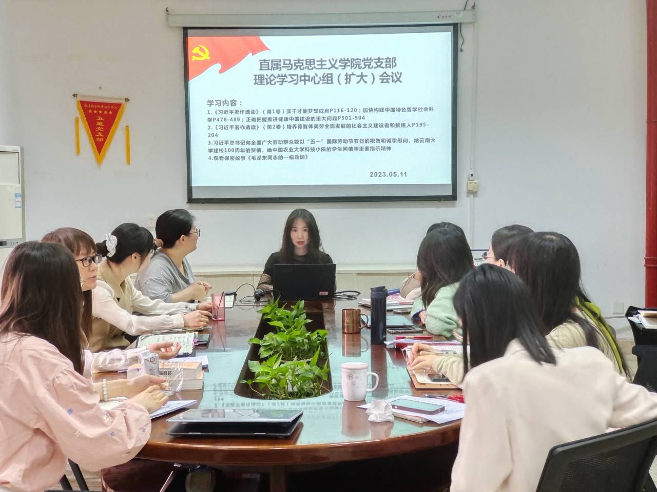 2023年5月11日,直屬馬克思主義學(xué)院黨支部在行政樓107開(kāi)展理論學(xué)習(xí)中心組(擴(kuò)大)會(huì)議。會(huì)議由黨支部書(shū)記熊美蘭主持。