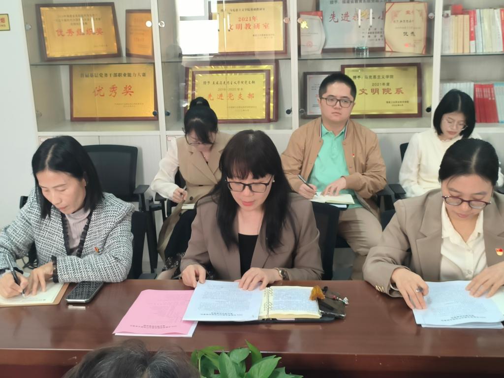 院黨總支書記熊美蘭從“壓緊壓實(shí)責(zé)任鏈條,著力扛起政治擔(dān)當(dāng)”“深學(xué)細(xì)悟理論精髓,著力筑牢思想支柱”“黨建領(lǐng)航融匯力量,著力深耕育人主業(yè)”三個方面對馬院全面從嚴(yán)治黨主體責(zé)任落實(shí)情況進(jìn)行了詳細(xì)匯報,同時對黨建業(yè)務(wù)融合、關(guān)鍵課程建設(shè)、黨員隊(duì)伍建設(shè)等工作中存在的問題與不足進(jìn)行了深入的剖析,并提出了下一步工作思路。