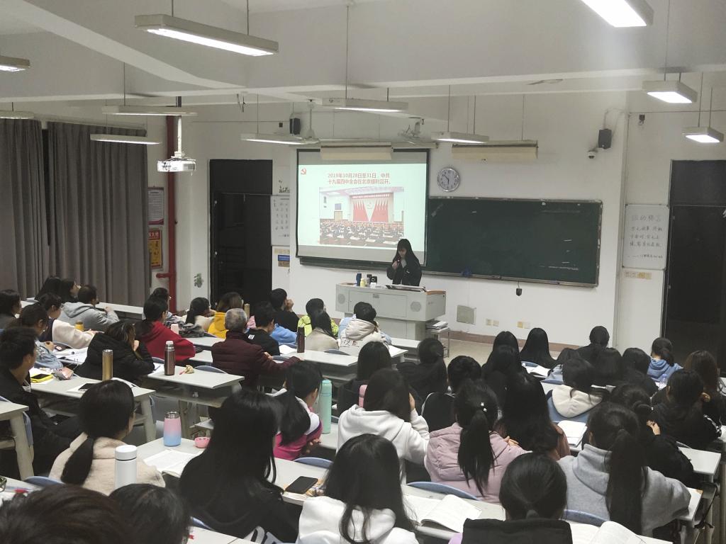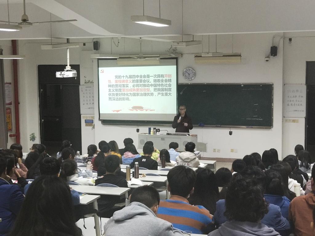 活動開始,由胡濟(jì)林老師向大家簡要介紹馬克思主義學(xué)院新成立的習(xí)近平新時代中國特色社會主義思想讀書社宣講團(tuán)的職責(zé)和使命,并歡迎同學(xué)報名參加。接著,胡老師說最近一段時期黨和國家政治生活中的一件大事是,中國共產(chǎn)黨勝利召開十九屆四中全會,審議通過了《中共中央關(guān)于堅持和完善中國特色社會主義制度、推進(jìn)國家治理體系和治理能力現(xiàn)代化若干重大問題的決定》。胡老師指出,中國特色社會主義制度是具有鮮明中國特色、顯著制度優(yōu)勢、強(qiáng)大自我完善能力的先進(jìn)制度,為中華民族迎來從站起來、富起來到強(qiáng)起來的偉大飛躍提供了根本制度保證。那么,如何將中國特色社會主義制度的巨大優(yōu)越性轉(zhuǎn)化為成熟而完善的治國理政的具體體制、機(jī)制和措施,使我們的制度更加鞏固、更加持久則是黨的十九屆四中全會研究的重要內(nèi)容。然后,胡老師邀請新思想讀書社宣講團(tuán)黃幼紅同學(xué)作了黨的十九屆四中全會精神的宣講,她宣講的題目是:準(zhǔn)確把握國家治理的關(guān)鍵和根本。黃幼紅同學(xué)在宣講中,既梳理了她學(xué)習(xí)黨的十九屆四中全會精神的心得體會,又列舉新中國成立70年來特別是改革開放40多年來一系列輝煌成就,加深同學(xué)們對中國共產(chǎn)黨的領(lǐng)導(dǎo)是中國特色社會主義最本質(zhì)的特征、對始終堅持黨的集中統(tǒng)一領(lǐng)導(dǎo)的認(rèn)識,黃幼紅同學(xué)說,我國社會主義政治制度優(yōu)越性的一個突出特點(diǎn)是黨發(fā)揮總攬全局、協(xié)調(diào)各方的領(lǐng)導(dǎo)核心作用,形象地說是“眾星捧月”,這個“月”就是中國共產(chǎn)黨。黃幼紅同學(xué)號召同學(xué)們把黨的十九屆四中全會精神學(xué)習(xí)好、領(lǐng)會好、貫徹好,學(xué)以致用,為實(shí)現(xiàn)中華民族偉大復(fù)興作出應(yīng)有的貢獻(xiàn)。