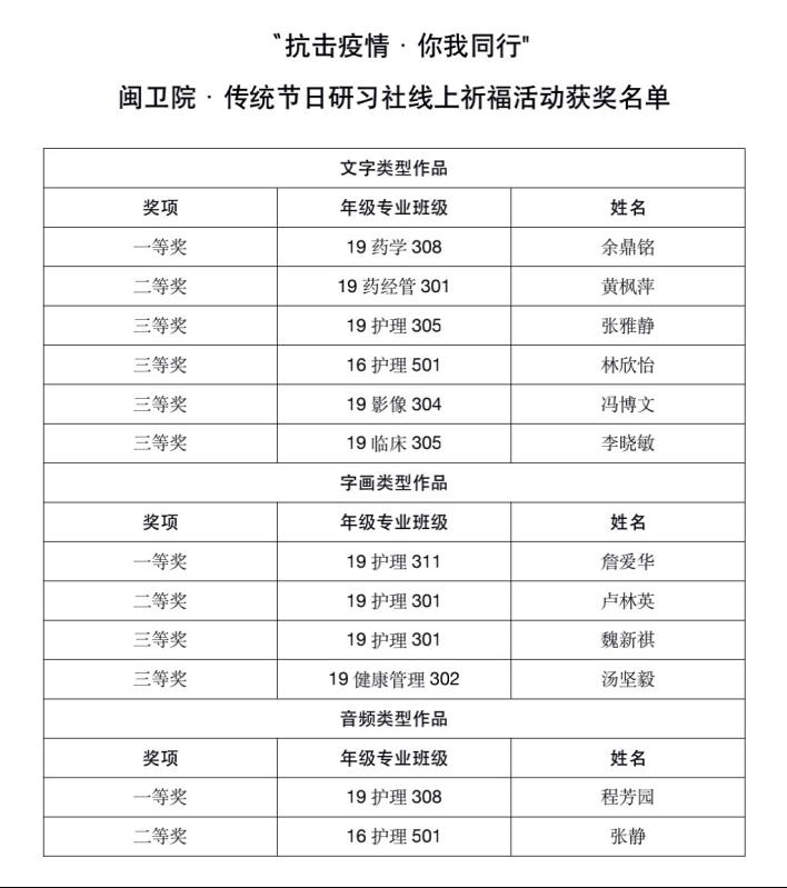此次活動歷時10天,分為2個階段。2020年2月26日至29日完成線上作品收集,2020年3月1日至3月6日為祈福作品的整理和投票階段。本次活動共收集書畫、文字及視頻類型作品共28份。同學(xué)們在這疫情非常時期,在緊張的網(wǎng)絡(luò)課程學(xué)習(xí)時期,利用課余時間,動起手來為此次疫情獻(xiàn)上自己的一份祝福。本次活動,經(jīng)由學(xué)生們自行評選,最后選出12份優(yōu)秀作品。