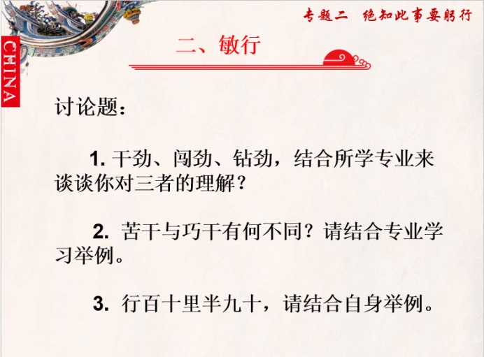 討論完了上節(jié)課的問題,我們又分別從尚行、敏行、力行三個維度,深入淺出地學(xué)習(xí)了,習(xí)近平總書記關(guān)于篤行的論述是對我國傳統(tǒng)文化中知行合一的精神和馬克思主義實踐觀的繼承和發(fā)展?!凹埳系脕斫K覺淺,絕知此事要躬行”,我們要多實踐,深入地學(xué)習(xí)并領(lǐng)會習(xí)近平的實踐觀。