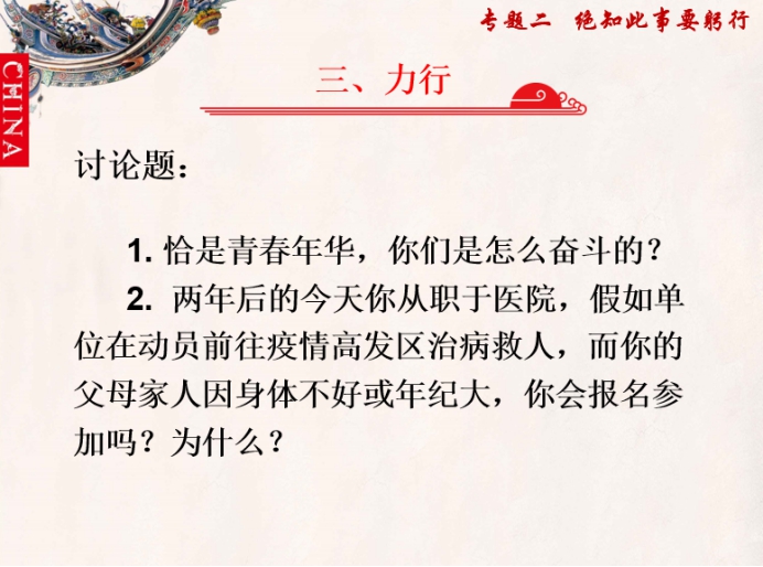 2020年2月25日,由熊美蘭老師所講授的《平“語”近人——習(xí)近平總書記用典》之“絕知此事要躬行”,再次開啟了網(wǎng)絡(luò)教學(xué)。熊美蘭老師先是對我們的課后作業(yè)進行的簡單的點評,并結(jié)合新冠肺炎疫情狀況,討論了上節(jié)課布置的課后思考題。對“不孝有三,無后為大”的理解,林靈同學(xué)發(fā)言:“不能事親(孝養(yǎng)父母、愛護家人),是一不孝;不能事君(恪守本分、忠義行事),是二不孝;不能立身行道,成為有道德的賢人君子,是三不孝”。而對于一些怕父母擔(dān)心未敢征求家人意見而舍命馳援湖北的醫(yī)護人員行為,讓同學(xué)們對“孝”則有了深入的看法,更加理解了孝的內(nèi)涵、大孝及小孝的區(qū)別,大家都非?;钴S,發(fā)表了自己的意見。有的人認(rèn)為,這是不孝,因為父母在,不遠游,我們還要贍養(yǎng)父母,要保證自己的安全。有的人認(rèn)為這是大孝,因為這個為國家做貢獻,國家是一個大的家庭,為大家舍小家,舍己救人,實為大孝。認(rèn)真而激烈的討論,體現(xiàn)我們醫(yī)學(xué)生對于疫情防控的認(rèn)識與重視,更加理解了有一種精神叫奉獻,有一種大孝叫精忠,有一種傳承叫愛國。正如黃旭華院士說的那樣,“對國家的忠,就是對父母最大的孝。”