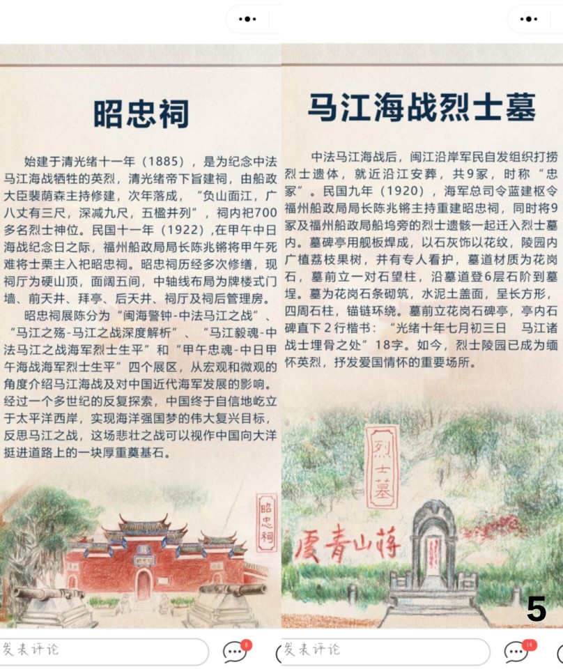 隨著線上導(dǎo)航走進(jìn)昭忠祠,我們看到昭忠祠介紹、烈士陵園和定位導(dǎo)航。為了紀(jì)念中法馬江海戰(zhàn)犧牲的英烈,昭忠祠始建于清朝光緒十一年,內(nèi)祀700多名烈士神位,從宏觀和微觀的角度紀(jì)念馬江海戰(zhàn)及對(duì)中國(guó)近代海軍發(fā)展的影響。在烈士陵園的評(píng)論區(qū),我們可以看到許多同學(xué)對(duì)于烈士表達(dá)的哀思,對(duì)烈士表達(dá)敬重之意。