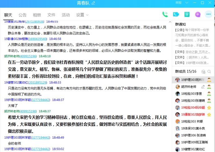 同學們在QQ進行簽到后,首先楊軍、魯麗、張凌晴3位同學分別向同學們進行了《為了人民謀發(fā)展的人大代表——季炳云》、《革命戰(zhàn)爭年代以及社會主義建設時期的人民觀》以及《抗擊疫情的普通人》的分享和交流,她們的分享讓我們明白了人民群眾是維護社會穩(wěn)定的主體力量,也是社會大局持續(xù)穩(wěn)定的源頭活水。