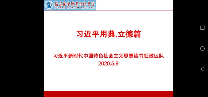 2020年5月9日,習近平新時代中國特色社會主義思想讀書社致遠隊社團選修課《習近平用典》第三次課“立德篇”開課。致遠隊全體成員參加了學習。