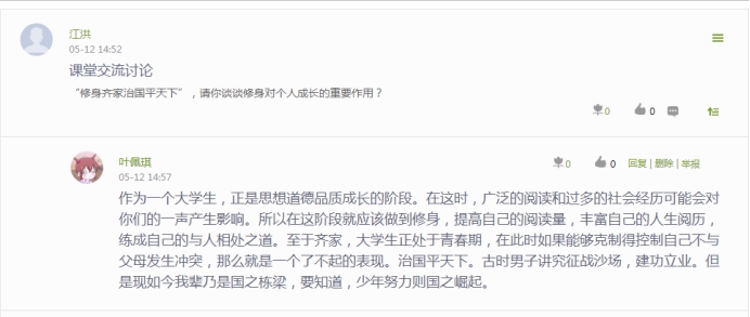 《修身篇》是《習(xí)近平用典》的第四篇,在這篇中,習(xí)近平總書記引用名言典故,強(qiáng)調(diào)了領(lǐng)導(dǎo)干部“修身”的重要性,深刻闡述了修身立德的方法。指導(dǎo)老師江洪老師通過(guò)線上觀看視頻、在線討論、提問(wèn)、觀看PPT等形式開(kāi)展這次課的學(xué)習(xí),使同學(xué)們對(duì)“修身自律”有了更深的理解,教導(dǎo)同學(xué)們要“吾日三省吾身”,做到自重、自省、自警、自勵(lì),實(shí)現(xiàn)慎獨(dú)、慎微、慎初、慎友。