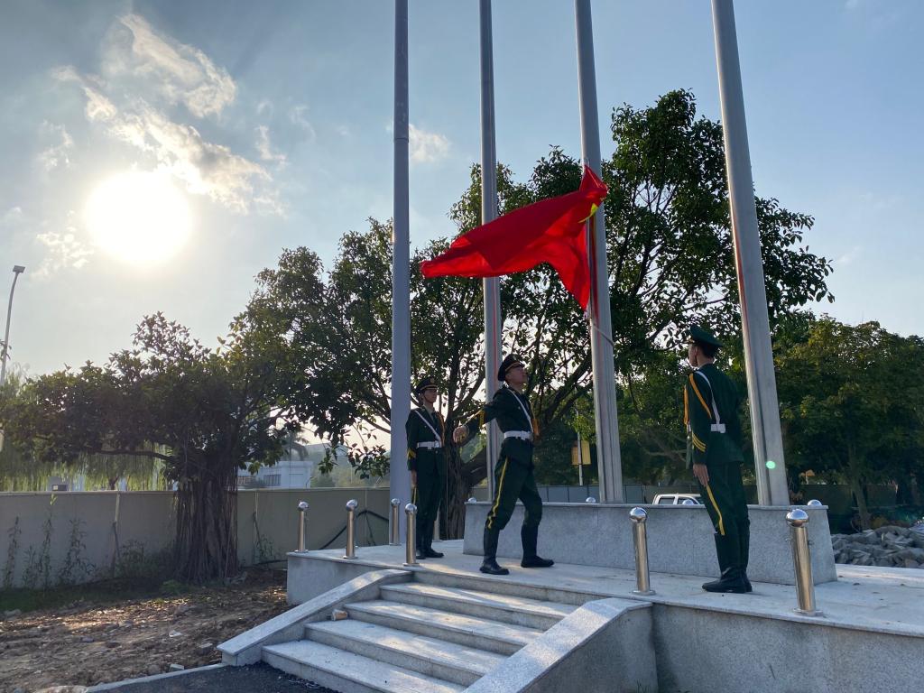 6點(diǎn)30分,升國(guó)旗儀式正式開(kāi)始,八一學(xué)社國(guó)旗護(hù)衛(wèi)隊(duì)踏著整齊劃一、鏗鏘有力的步伐,護(hù)送鮮艷的五星紅旗入場(chǎng),全體社員面向國(guó)旗莊嚴(yán)肅立,行注目禮。伴隨著雄壯激昂的《義勇軍進(jìn)行曲》,國(guó)旗冉冉升起,迎風(fēng)飄揚(yáng),全體社員齊唱國(guó)歌,向國(guó)旗致敬,共同祝福祖國(guó)母親生日快樂(lè)。