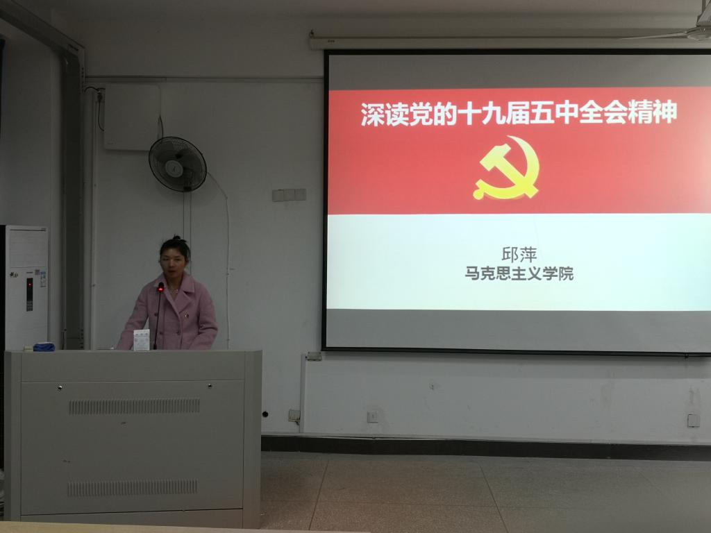 邱萍老師從規(guī)劃《建議》起草、規(guī)劃《建議》亮點(diǎn)、規(guī)劃《建議》突出民生議題、雙循環(huán)的新發(fā)展格局、如何實(shí)現(xiàn)2035年遠(yuǎn)景目標(biāo)等五個(gè)方面進(jìn)行了系統(tǒng)宣講闡釋,既講清楚宏觀上的政策舉措,又不時(shí)引用接地氣的鮮活案例,讓學(xué)生們對(duì)五中全會(huì)精神有了切身的體會(huì)。邱萍老師勉勵(lì)大家把小我融入國(guó)家發(fā)展的大我之中,明確人生目標(biāo),找準(zhǔn)奮斗著力點(diǎn),學(xué)好本領(lǐng),潛心鉆研,掌握觀察和認(rèn)識(shí)世界的正確方法,努力成為國(guó)家棟梁。
