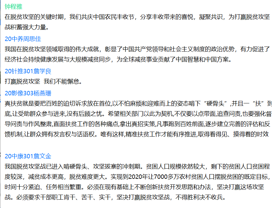 胡老師報告結(jié)束后,由方聲心、詹學良和詹文金三位同學分別進行了《把事業(yè)放在心上,把責任放在肩上》、《決戰(zhàn)決勝脫貧攻堅》、《國家情懷鑄就脫貧力量》的分享和交流,他們各自從高質(zhì)量完成脫貧攻堅、以非常之力實現(xiàn)全面勝利、鞏固戰(zhàn)果、繼續(xù)沖鋒向前等方面總結(jié)了中國在脫貧攻堅取得的成就,讓同學們了解到脫貧攻堅戰(zhàn)不是輕輕松松一沖鋒就能打贏的,靠的是黨的堅強領(lǐng)導,靠的是中華民族自力更生、艱苦奮斗的精神品質(zhì),靠的是新中國成立以來特別是改革開放以來積累的堅實物質(zhì)基礎(chǔ)。三位同學制作的課件精美,演講內(nèi)容熟悉,受到老師和同學的好評。會議最后,同學們進行本次學習的交流與分享。
