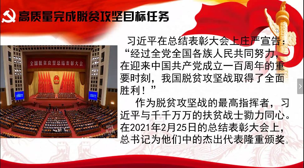 本次專題學習持續(xù)了45分鐘,內(nèi)容豐富,同學們收獲滿滿。凡是過往,皆為序章……脫貧摘帽不是終點,而是新生活、新奮斗的起點。大家表示,通過此次學習,更加深入把握了脫貧攻堅精神,拓寬了歷史視野,堅定了信心決心,我們將乘勢而上開啟全面建設(shè)社會主義現(xiàn)代化國家新征程!