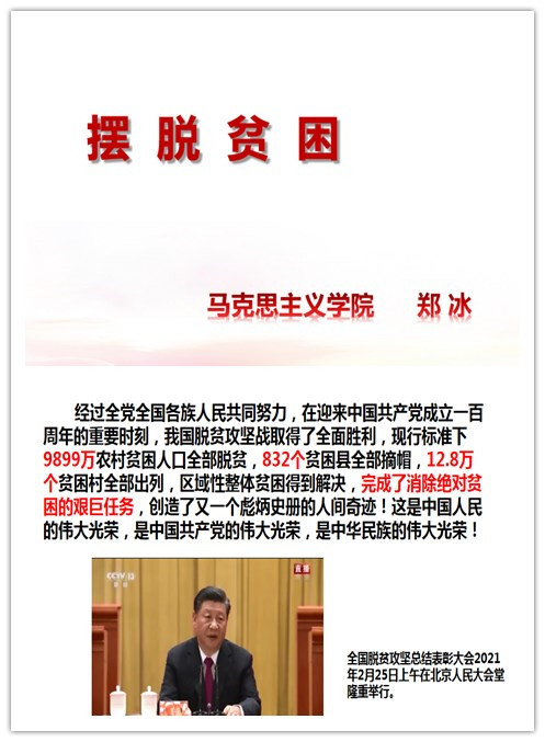 課上,鄭冰老師通過打贏脫貧攻堅戰(zhàn)主題歌曲《和你在一起》導(dǎo)入本次課程,并傳達了習(xí)近平總書記在全國脫貧攻堅總結(jié)表彰大會上的講話精神,讓同學(xué)們深刻認識到學(xué)習(xí)《擺脫貧困》的重要性和意義。緊接著鄭冰老師從習(xí)近平同志簡歷、《擺脫貧困》創(chuàng)作背景、《擺脫貧困》主題思想、作品文風(fēng)四個方面為大家進行授課,讓大家了解《擺脫貧困》創(chuàng)作背景,明確《擺脫貧困》主題思想。通過了解作者的簡歷和創(chuàng)作背景,從而把握作者極富創(chuàng)造性的戰(zhàn)略思想、極富前瞻性的制度理論和極富針對性的實踐觀點,為后續(xù)學(xué)習(xí)奠定了一定的基礎(chǔ)。