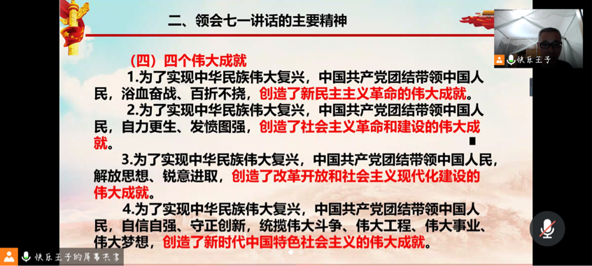 為了更好地領(lǐng)會(huì)習(xí)近平總書記在慶祝中國(guó)共產(chǎn)黨成立100周年大會(huì)上的重要講話精神,2021年9月20日晚上,習(xí)近平新時(shí)代中國(guó)特色社會(huì)主義思想讀書社宣講團(tuán)在騰訊會(huì)議開(kāi)展專題學(xué)習(xí)活動(dòng),此次活動(dòng)主要由胡濟(jì)林老師宣講。
