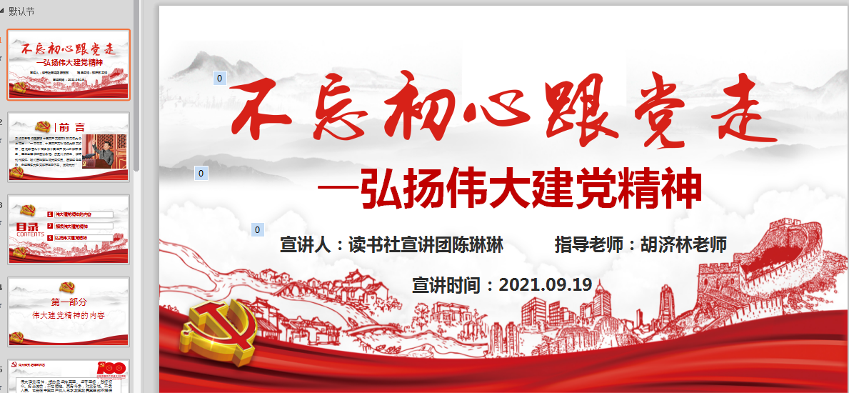 2021年9月19日下午,在胡濟林老師的指導下,習近平新時代中國特色社會主義思想讀書社宣講團在線上通過騰訊會議,為20中醫(yī)養(yǎng)生保健301班、20營養(yǎng)301班開展“不忘初心 跟黨走----不忘初心 跟黨走—弘揚偉大建黨精神”主題宣講。