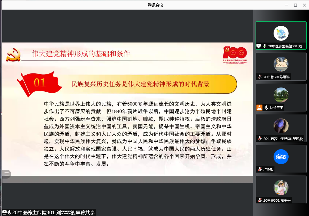 2021年9月27日下午,習(xí)近平新時代中國特色社會主義思想讀書社宣講團在馬克思主義學(xué)院胡濟林老師的組織下,為20中醫(yī)養(yǎng)生保健301班、20營養(yǎng)301班開展線上學(xué)習(xí)“偉大建黨精神----中國共產(chǎn)黨的精神之源走”專題宣講。