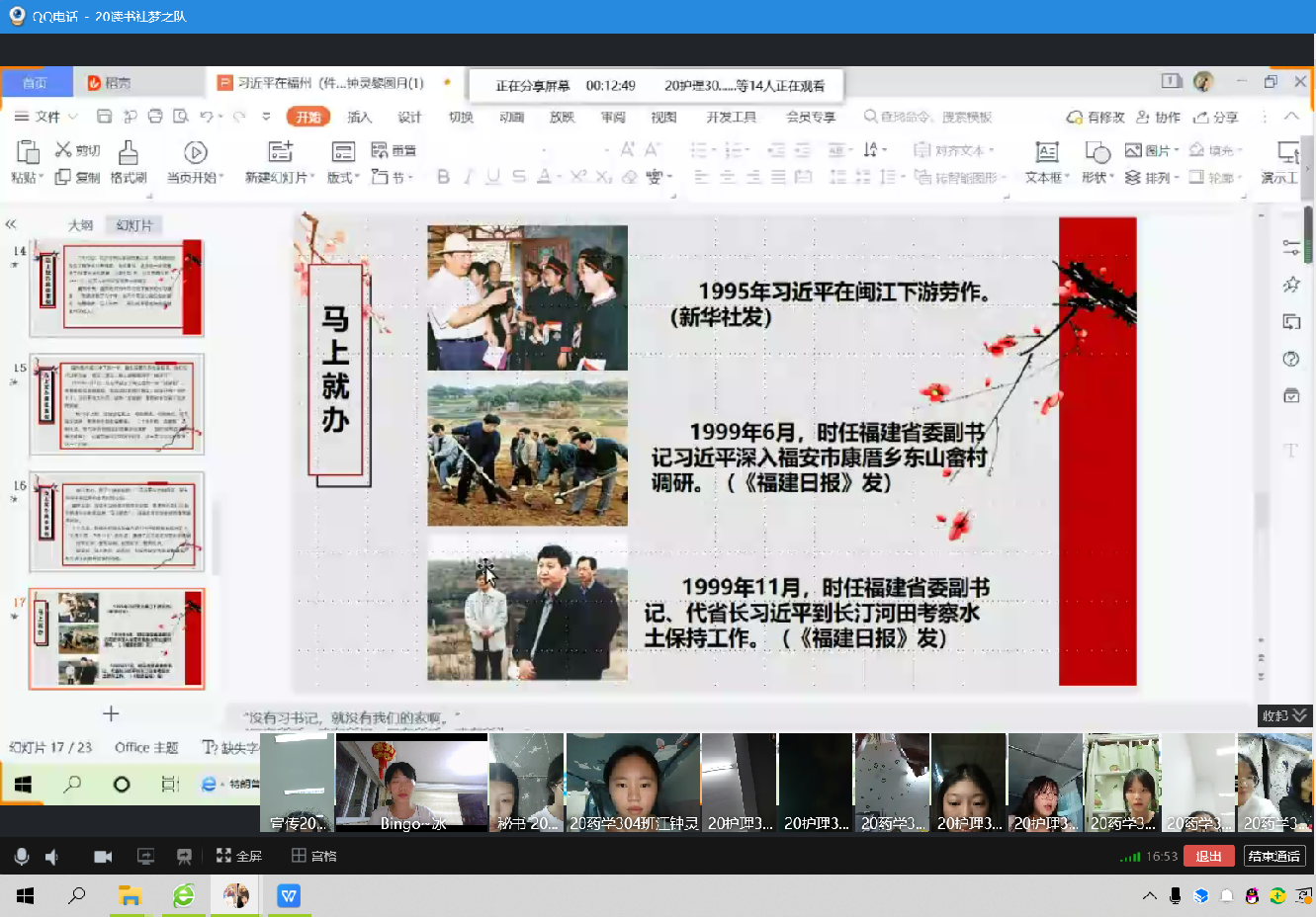 本次學習之前,江鐘靈小組的同學和鄭冰老師就學習內容進行了多次溝通并最終確定,黎圓月同學首先帶領大家了解習近平總書記在福州開展工作的概況,并通過福州市動物園的問題、福州市棚戶區(qū)改造以及連家船民住房問題的解決等事件,讓大家深入了解習近平總書記如何帶領領導干部做到“馬上就辦”。
