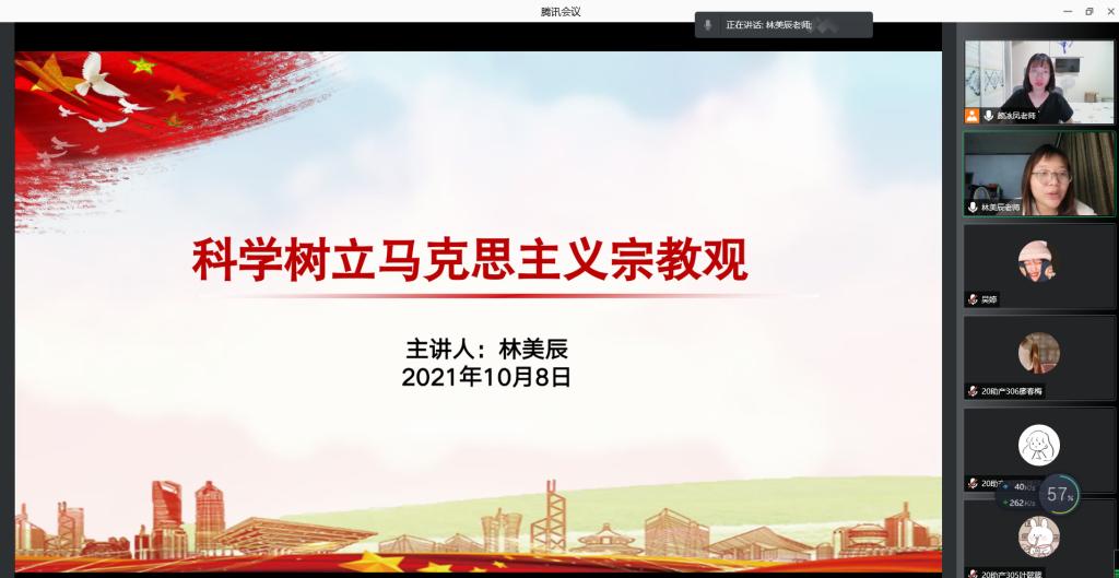 為深入學(xué)習(xí)貫徹習(xí)近平總書記關(guān)于宗教工作重要論述和重要指示批示精神,樹立馬克思主義宗教觀,培養(yǎng)青年學(xué)生正確思想道德價值觀。2021年10月8日晚,馬克思主義學(xué)院林美辰、顏冰鳳兩位老師為社團全體成員開展了線上學(xué)習(xí)宣講。