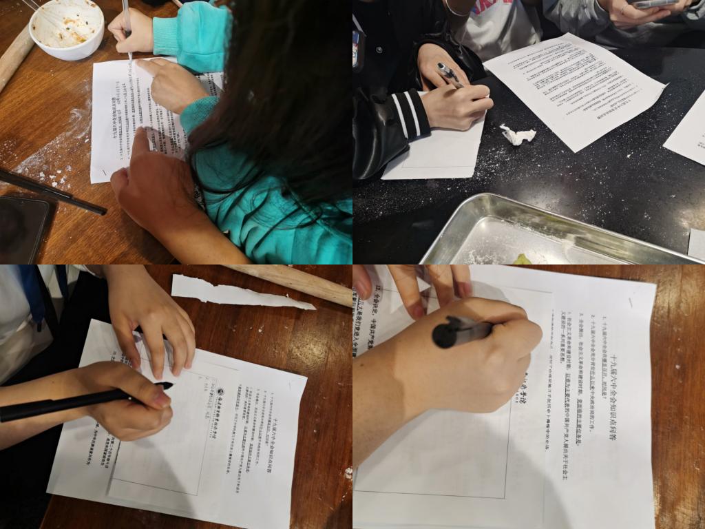 現(xiàn)場活動(dòng)伊始,傳統(tǒng)節(jié)日研習(xí)社的指導(dǎo)老師顏冰鳳帶領(lǐng)全體同學(xué)學(xué)習(xí)了黨的十九屆六中全會(huì)精神,鼓勵(lì)大家從中國共產(chǎn)黨百年奮斗歷程中汲取經(jīng)驗(yàn)啟示,腳踏實(shí)地、精益求精,不負(fù)韶華,為夢想奮斗。隨后社長對冬至這一節(jié)氣進(jìn)行介紹,讓同學(xué)們了解冬至的來歷、習(xí)俗等傳統(tǒng)文化知識。緊接著圍繞黨的十九屆六中全會(huì)知識與冬至小知識進(jìn)行競答比賽,成員們以小組為單位踴躍參與、氣氛熱烈,通過知識競賽,同學(xué)們對黨的百年奮斗過程有了更深的了解,也掌握了冬至的相關(guān)知識。