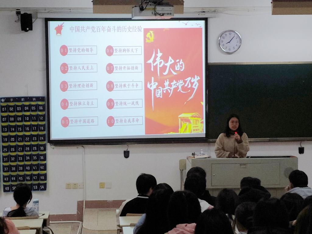 開(kāi)展本次宣講的是李海丹和張玲馨小組,宣講人是李海丹,她首先給大家介紹中國(guó)共產(chǎn)黨的性質(zhì)和歷史使命,分享了黨的奮斗百年的十個(gè)歷史經(jīng)驗(yàn),并結(jié)合抗美援朝和抗擊新冠肺炎疫情,重點(diǎn)闡述堅(jiān)持人民至上、堅(jiān)持敢于斗爭(zhēng)等歷史經(jīng)驗(yàn),隨后分享了黨的奮斗百年的歷史意義,她號(hào)召同學(xué)們學(xué)好黨史,堅(jiān)持以習(xí)近平新時(shí)代中國(guó)特色社會(huì)主義思想為指導(dǎo),為實(shí)現(xiàn)中華民族偉大復(fù)興的中國(guó)夢(mèng)貢獻(xiàn)出綿薄之力。