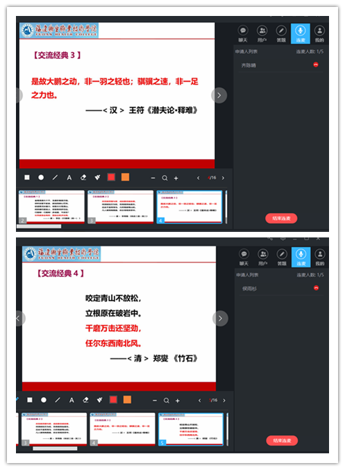 課上,同學(xué)們分組通過連麥的方式逐組進(jìn)行匯報。同學(xué)們對自己組選用的“長風(fēng)破浪會有時,直掛云帆濟(jì)滄?!薄皻v覽前賢國與家,成由勤儉破由奢”“是故大鵬之動,非一羽之輕也;騏驥之速,非一足之力也”“千磨萬擊還堅勁,任爾東西南北風(fēng)”“寶劍鋒從磨礪出 ,梅花香自苦寒來”“大鵬一日同風(fēng)起,扶搖直上九萬里”等習(xí)近平總書記引用過的經(jīng)典名言進(jìn)行深入的解讀、闡述。每組交流結(jié)束后,江洪都會對同學(xué)們的發(fā)言進(jìn)行總結(jié)與評價,讓同學(xué)們有更深的感悟和理解。