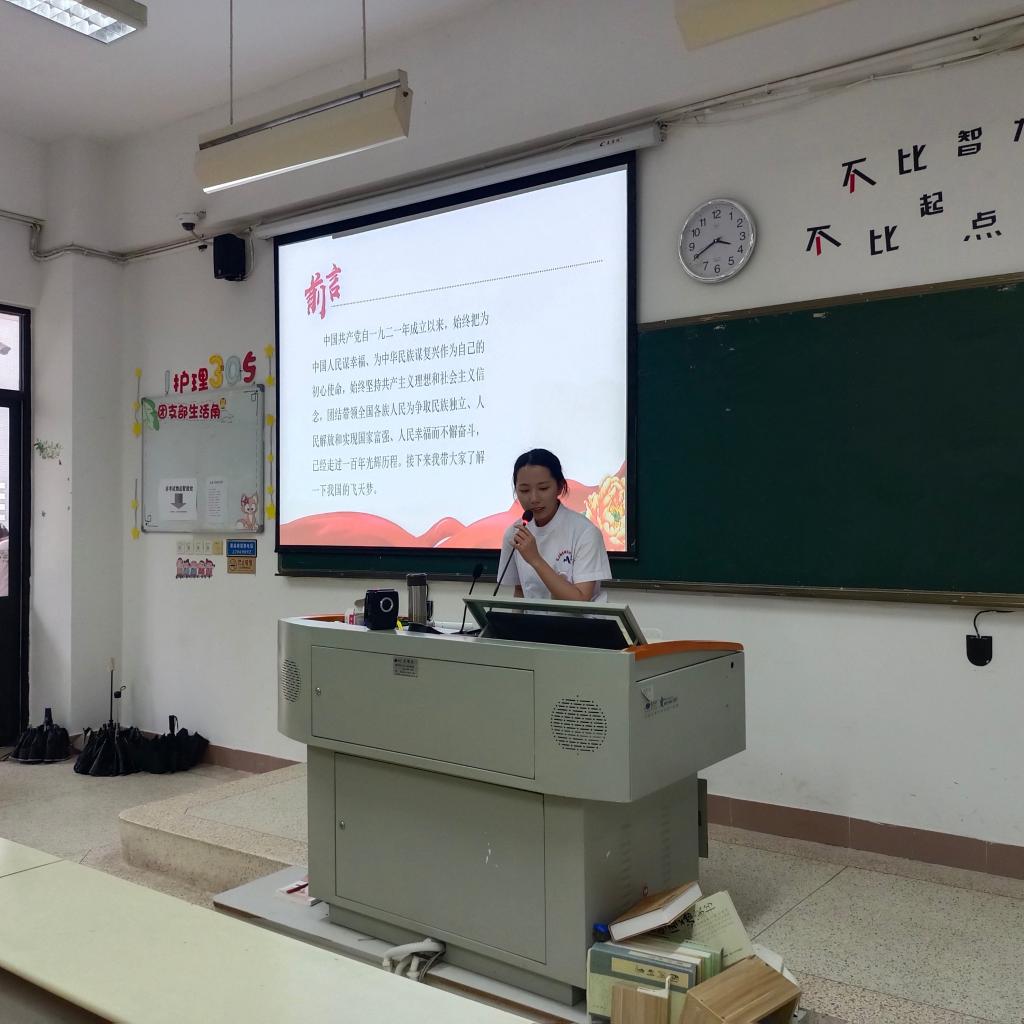 本次宣講的是江麗清和陳可欣小組,宣講人江麗清同學,宣講主題是中國夢航天夢。江麗清從介紹了中國古人對天空的奇思妙想,再到萬戶火箭飛行的大膽嘗試,從世界上第一顆人造衛(wèi)星對我國航天事業(yè)的激勵,再到我國東方紅一號的成功發(fā)射,演繹了我國人民懷揣不懈追求的航天夢,敢于戰(zhàn)勝一切艱難險阻,勇于攀登航天科技高峰的載人航天精神。雄關漫道真如鐵,而今邁步從頭越。江麗清說:“探索浩瀚宇宙,發(fā)展航天事業(yè),建設航天強國,是我們不懈追求的航天夢?!?/p>