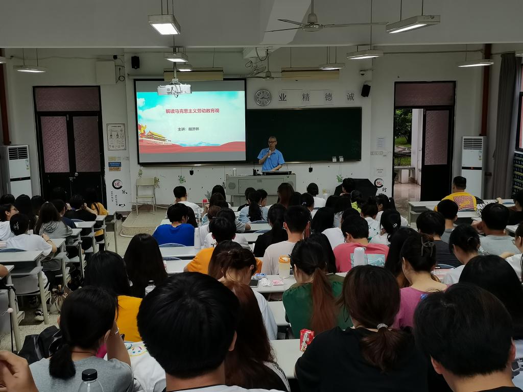 宣講伊始,胡濟林帶領(lǐng)同學(xué)們從“勞動創(chuàng)造世界”“勞動創(chuàng)造歷史”“勞動創(chuàng)造人本身”等方面解讀馬克思主義勞動教育觀。接著介紹中國共產(chǎn)黨繼承和發(fā)展了馬克思主義勞動價值觀、勞動教育觀。黨的十八大報告指出,全社會應(yīng)認真貫徹和落實“四個尊重”,即尊重勞動、尊重知識、尊重人才、尊重創(chuàng)造。其中,尊重勞動作為四個尊重之首。十九大報告中提出,“營造勞動光榮的社會風(fēng)尚”,“弘揚勞模精神和工匠精神”。教育部《大中小學(xué)勞動教育指導(dǎo)綱要(試行)》指出,要使學(xué)生“樹立正確的勞動觀念”“具有必備的勞動能力”“培育積極的勞動精神”“養(yǎng)成良好的勞動習(xí)慣和品質(zhì)”。這些重要論斷進一步豐富和發(fā)展了馬克思主義的勞動價值觀、勞動教育觀。最后,胡濟林結(jié)合大學(xué)生實際情況,希望同學(xué)們注意培養(yǎng)勞動觀念,珍惜他人的勞動成果,提高勞動技能。