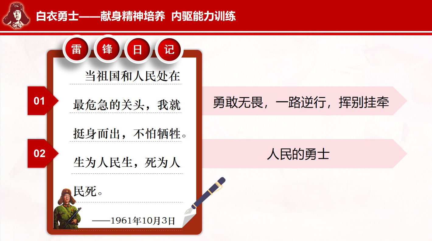 “健康所系,性命相托”,始終牢記步入神圣醫(yī)學(xué)學(xué)府時的莊嚴(yán)宣誓,以白衣作戰(zhàn)袍,主動請纓、挺身而出,以舍生忘死的責(zé)任使命同時間賽跑、與病魔較量。要學(xué)習(xí)雷鋒在緊急關(guān)頭挺身而出、勇于擔(dān)當(dāng)?shù)木?,在危難關(guān)頭挺身而出,做一個審慎從醫(yī)、勇于擔(dān)當(dāng)?shù)睦卒h式白衣天使。