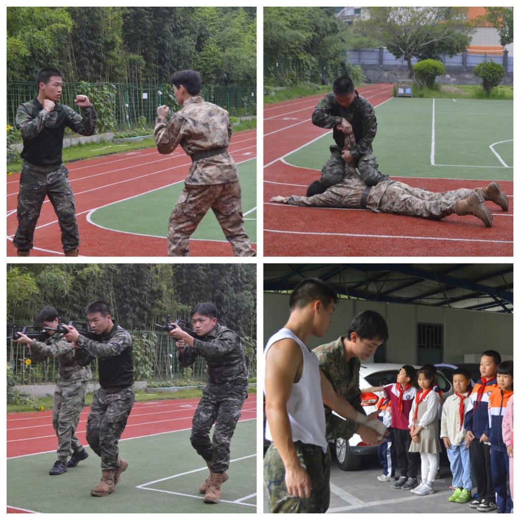 接著,八一學(xué)社與國旗護(hù)衛(wèi)隊一行來到操場,活動進(jìn)入到實踐展示環(huán)節(jié)。由八一學(xué)社3名退役大學(xué)生進(jìn)行擒敵、倒功、軍事戰(zhàn)術(shù)動作展示等軍事技能幫教互動,以及戰(zhàn)場快速包扎急救互救。其中,軍事技能的展示引起在場小學(xué)生們熱烈鼓掌,在他們心中樹立了崇高軍人形象。而戰(zhàn)傷救護(hù)是作為醫(yī)學(xué)生們履行職責(zé)、保障患者生命安全的體現(xiàn)。