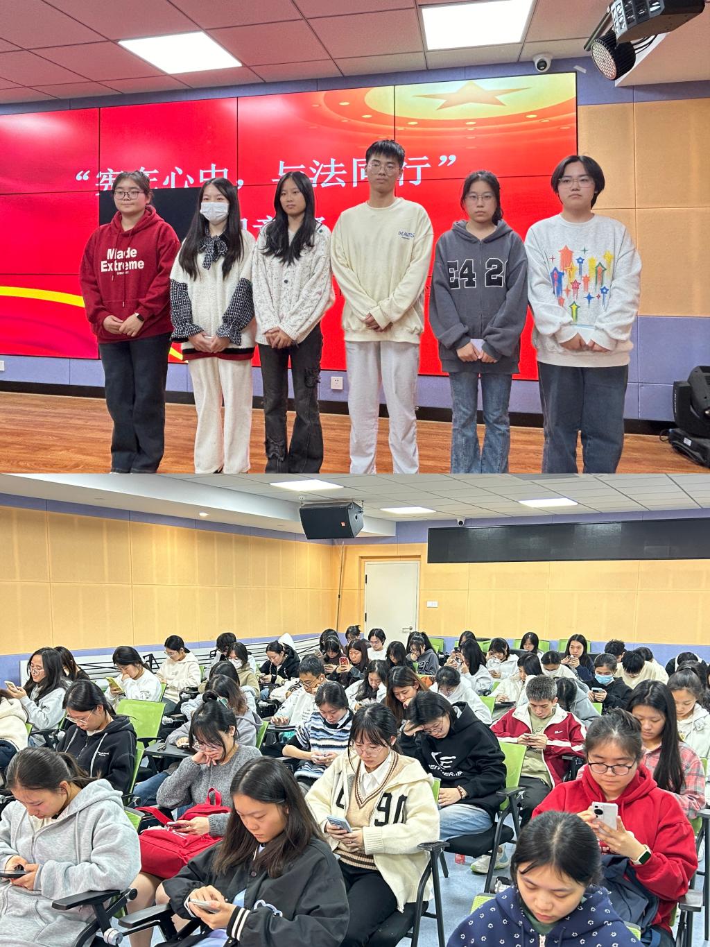 “執(zhí)憲法之燈,譜盛世華章”主題征文活動現(xiàn)場氣氛熱烈,參賽選手全情投入,通過文字描繪出自己心中法治社會的藍圖,共同探討憲法精神在現(xiàn)代社會的重要性堅定自己學(xué)法、用法、守法的決心?!皯椩谛闹?,與法同行”知識競賽內(nèi)涵豐富,競賽內(nèi)容涵蓋了憲法的歷史、基本原則、重要條款等多方面,旨在全面考察參賽者對憲法的理解和掌握程度。比賽現(xiàn)場選手們紛紛展現(xiàn)出自己的智慧和才華,激勵著大家了解更多憲法和法律常識,讓學(xué)生群體增強法治觀念,將尊法學(xué)法守法用法深深地鐫刻在心中。