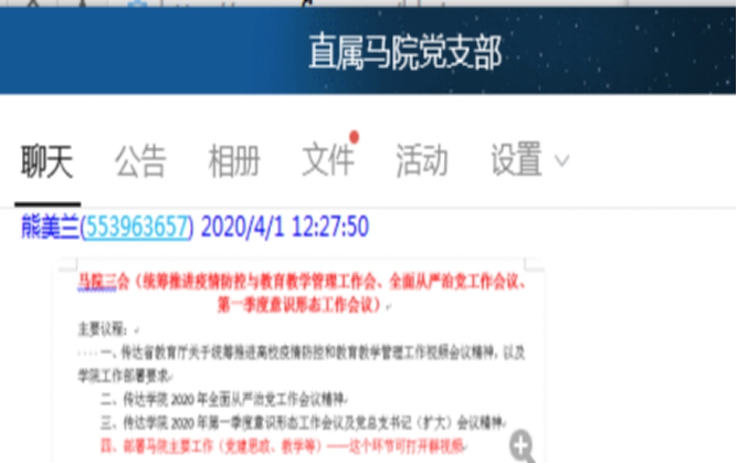 “疫情就是命令,防控就是責(zé)任”。2020年4月1日,直屬馬克思主義學(xué)院黨支部通過網(wǎng)絡(luò)視頻召開統(tǒng)籌推進(jìn)高校疫情防控和教育教學(xué)管理工作會議。會議由支部書記熊美蘭主持,全體教師黨員參加了會議。