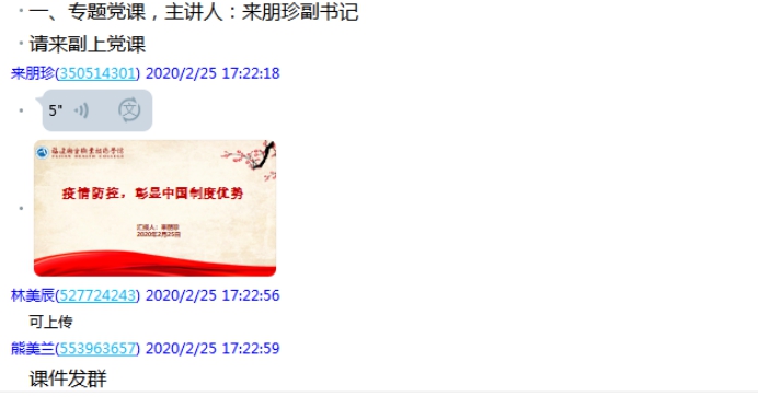 為更好地做好疫情防控工作,發(fā)揮馬院的示范引領(lǐng)作用,2020年2月25日下午,直屬馬克思主義學院黨支部利用QQ群網(wǎng)絡(luò)平臺召開了一場疫情防控的專題黨課學習會。該次黨課學習會由支部書記熊美蘭主持,支部副書記來朋珍主講。直屬馬克思主義學院黨支部全體教師黨員參加了學習。