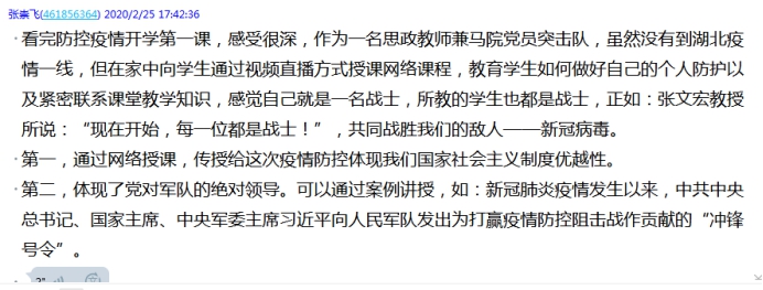 張崇飛老師表示,看完張文宏教授和吳凡教授防控疫情開學第一課,感受很深,作為一名思政教師兼馬院黨員突擊隊隊員,雖然沒有到湖北疫情一線,但在家中向?qū)W生通過視頻直播方式授課,教育學生如何做好自己的個人防護,感覺自己就是一名戰(zhàn)士,所教的學生也都是戰(zhàn)士,正如:張文宏教授所說:“現(xiàn)在開始,每一位都是戰(zhàn)士!”這次疫情抗擊,體現(xiàn)了黨對軍隊的絕對領(lǐng)導,體現(xiàn)了我們國家社會主義制度優(yōu)越性。