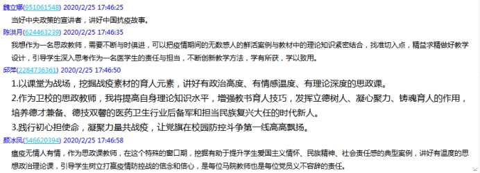 二是守住思政戰(zhàn)場,上好課教好書。要從教學內(nèi)容、教法進行鉆研,包括語言表達,講好戰(zhàn)“疫”故事,切實做好思政引導工作。例如,昨天上午防控講座專家張文宏主任,也是復(fù)旦大學醫(yī)學院教授,防控金句不斷,生動幽默,人氣值達到數(shù)十萬,“你在家里不是隔離,是在戰(zhàn)斗啊”“防火防盜防同事”“你不是醫(yī)生,但是你做的事情,比醫(yī)生還重要”,最后以“冬將盡,春可期,山河無恙,人間皆安”結(jié)尾。要注重研究線上教學由于各因素引發(fā)學生學習不適應(yīng)等情況,思考線上教學局限如何突破,做好查漏補缺教學工作。
