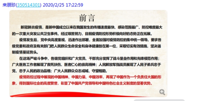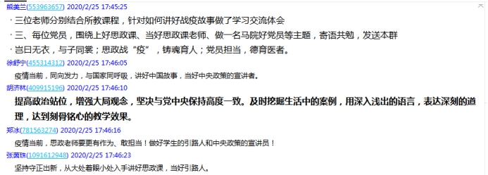顏冰鳳老師:瘟疫無情人有情,作為思政課教師,在這個特殊的窗口期,挖掘有助于提升學生愛國主義情懷、民族精神、社會責任感的典型案例,講好有溫度的思想政治理論課,引導學生樹立打贏疫情防控戰(zhàn)的信念和信心,是每位馬院教師也是每位黨員義不容辭的責任。