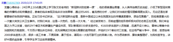 龍慧老師表示,24日上午10點通過網(wǎng)上學習張文宏和吳凡兩位老師的“新冠肺炎防控第一課”,讓我們對當前肺炎疫情的情況理解得更加深入,對我們做好自我保護措施有很大的幫助作用,作為思政課教師,要收集整理好抗擊疫情典型案例,為我校醫(yī)學生講好中國抗疫故事,引導學生學習這些英雄精神。