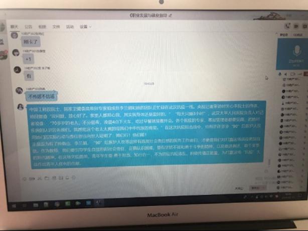 (圖為思政教師組織學(xué)生觀看抗擊疫情視頻,并與學(xué)生們開展線上互動(dòng)討論)