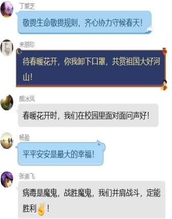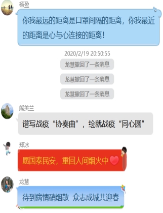 在疫情防控的關(guān)鍵時刻,馬院教師傳遞的每一句祝福,都是一份溫暖人心的“情歌”,都是一種攻克難關(guān)的力量,是我們打好打贏這場抗疫阻擊戰(zhàn)的精神食糧,也傳達出堅決打贏防控疫情阻擊戰(zhàn)的必勝決心。盡管疫情嚴峻,但愛的眾籌沒有時限;縱使有萬般艱難,萬眾一心的向心力定會擊垮疫情。