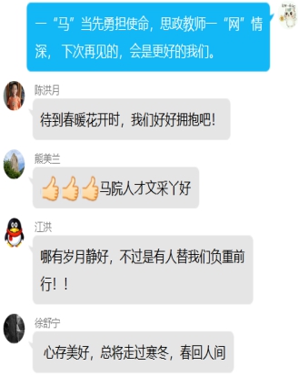 這是有政治高度、有情感溫度、有理論深度的網(wǎng)絡思政課,讓遠在千里之外的學子們不僅感受了網(wǎng)絡課堂的魅力,也經(jīng)受了一次深刻的心靈洗禮,接受了一次深刻的愛國主義思想教育。同學們紛紛留言,互動討論,一致認為,病毒雖然無情,但阻擋不了人間真情,阻擋不了學子對知識的追求,透過屏幕,他們感受了不一樣的課堂和不一樣的情懷。