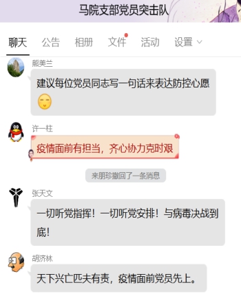 馬院組織教師利用騰訊、學習通、優(yōu)學堂、天使之城等網(wǎng)絡平臺講好抗“疫”特殊時期思政課。1.形勢與政策課教師給學生上了特殊的一課——《堅定信心打贏疫情防控阻擊戰(zhàn)》,并與學生們開展“疫情給我們的啟示”的討論,引導學生理性認識、正確對待疫情,增強戰(zhàn)勝疫情的信心,并號召廣大學生做防控疫情的參與者,做自我保護的先行者,做傳播正能量的維護者;2.概論課教師在講授理論課前,先給學生觀看抗擊疫情短視頻《同時間賽跑》、《愛滿大中國——鄂滬元宵節(jié)同唱一首歌》,視頻結(jié)束后要求學生做關(guān)于疫情防控的練習題并組織學生討論“中華民族是歷經(jīng)磨難、百折不撓的民族,困難和挑戰(zhàn)越大,凝聚力和戰(zhàn)斗力就越強?!保?.軍事理論課教師組織學生觀看《防范新型冠狀病毒宣傳視頻》,開展“寫一句話送給奮斗在一線的最美戰(zhàn)“疫”者們”的互動;4.就業(yè)指導課教師在教學案例中把共產(chǎn)黨員沖鋒在前,醫(yī)務人員日夜奮戰(zhàn),科研人員全力攻關(guān),眾多勞動者堅守崗位、默默付出,無數(shù)企業(yè)和個人慷慨解囊、捐贈捐助等一系列案例與學生分享,讓同學們談談新時代醫(yī)學生的使命和擔當。