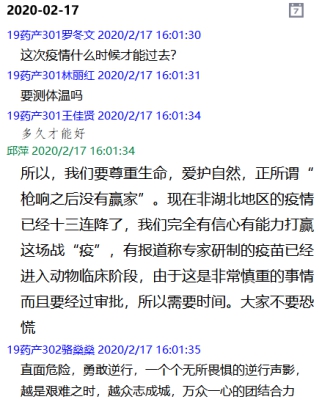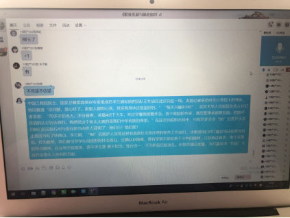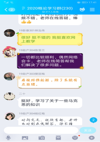 馬院建立了開學(xué)前思政課任課教師與學(xué)生班級群的線上溝通機制,教師參與班級群討論,授課過程中適時進(jìn)行在線指導(dǎo)和答疑,引導(dǎo)學(xué)生理性對待疫情發(fā)展,擁護黨中央的防疫政策,鼓勵學(xué)生言論中的正能量,發(fā)現(xiàn)學(xué)生不良的思想或心理苗頭,舒緩一些學(xué)生負(fù)面的情緒,營造一個良好的思想氛圍。