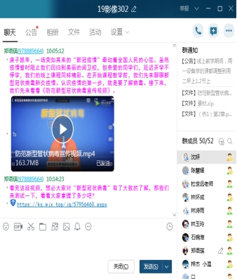 形勢與政策課教師利用QQ和超星學(xué)習(xí)通等平臺在線上給學(xué)生上了一堂特殊的課——《堅定信心打贏疫情防控阻擊戰(zhàn)》,并與學(xué)生們開展線上互動討論;概論課教師在授課開學(xué)第一課“千年思想家馬克思”前,先給學(xué)生觀看抗擊疫情短視頻《同時間賽跑》,視頻結(jié)束后要求學(xué)生做關(guān)于疫情防控的練習(xí)題并組織討論發(fā)言;軍事理論課教師將疫情防控課程作為開學(xué)第一課的內(nèi)容,組織學(xué)生觀看《防范新型冠狀病毒宣傳視頻》。