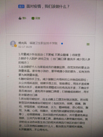 思政教師一是通過語音溝通、線上答疑、轉(zhuǎn)發(fā)防控知識等方式,教會學(xué)生預(yù)防和防控新型冠狀病毒,進(jìn)行健康理念和自我保護教育;二是通過解碼新型冠狀肺炎病毒及其主要癥狀,引導(dǎo)學(xué)生樹立科學(xué)觀念,不信謠、不傳謠;三是通過解讀習(xí)近平總書記關(guān)于新型黃莊肺炎疫情防控的重要講話精神,幫助學(xué)生認(rèn)識社會主義制度的優(yōu)越性,從而堅定打贏疫情防控阻擊戰(zhàn)的信心。