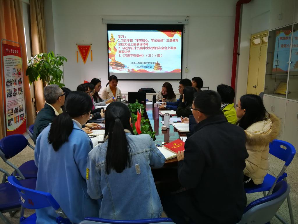 2020年1月16日上午,直屬馬克思主義學院黨支部在行政樓107會議室舉行集體學習會議,集中學習習近平在“不忘初心、牢記使命”主題教育總結大會上的講話精神、習近平總書記在十九屆中央紀委四次全會上的重要講話、《習近平在福州》(三)(四)。會議由直屬馬克思主義學院黨支部書記熊美蘭主持,黨支部全體黨員參加了會議。