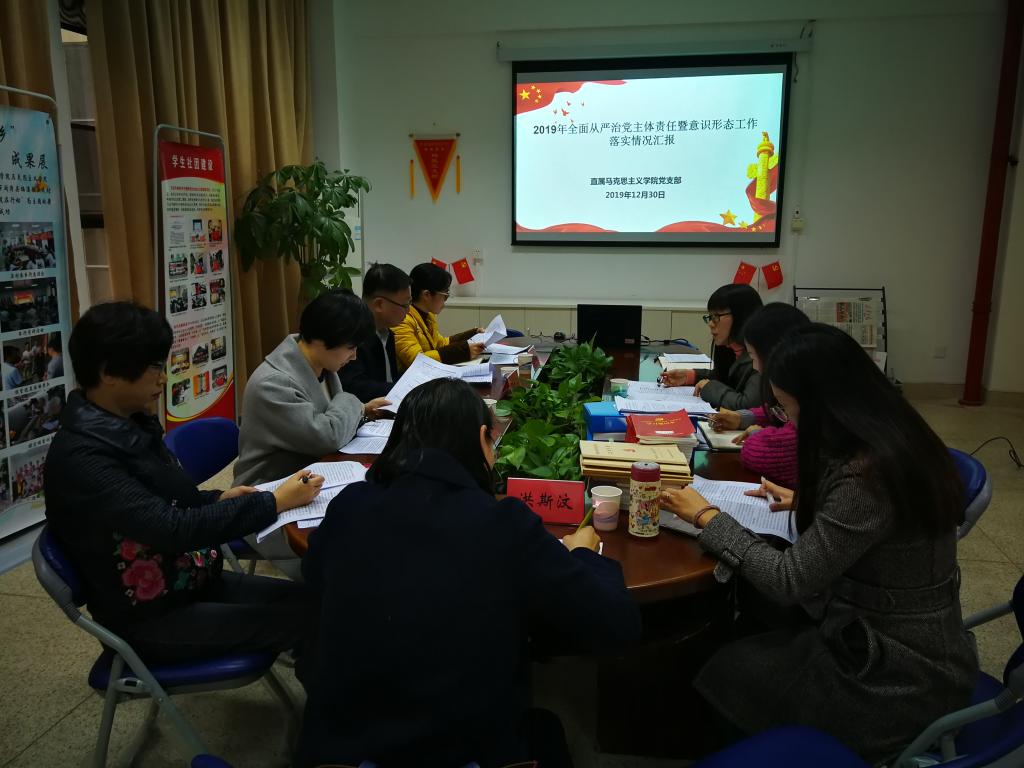 2019年12月30日下午,學(xué)校全面從嚴治黨主體責(zé)任暨意識形態(tài)工作專項巡查“回頭看”交叉巡查組組長曾武祈書記、成員阮秋容、吳華、程劍芬一行到馬克思主義學(xué)院行政樓107會議室檢查2019年度直屬馬克思主義學(xué)院黨支部全面從嚴治黨主體責(zé)任暨意識形態(tài)工作落實情況。直屬馬克思主義學(xué)院黨支部全體委員參加會議。