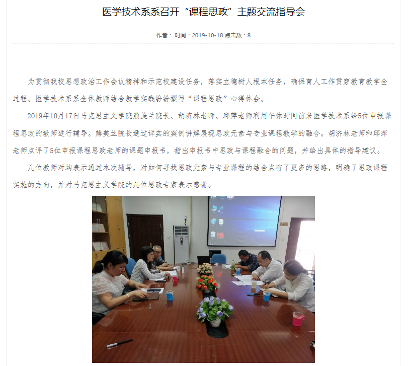 為貫徹全國高校思想政治工作會議精神和我校立德樹人人才培養(yǎng)的目標要求,將思政教育元素與專業(yè)課程有效融合,切實做到“三全育人”,馬院熊美蘭院長、胡濟林老師和邱萍老師等一行來到醫(yī)學技術系會議室與5位專業(yè)課教師開展“課程思政”課程建設項目交流指導。具體內容詳見下面新聞: